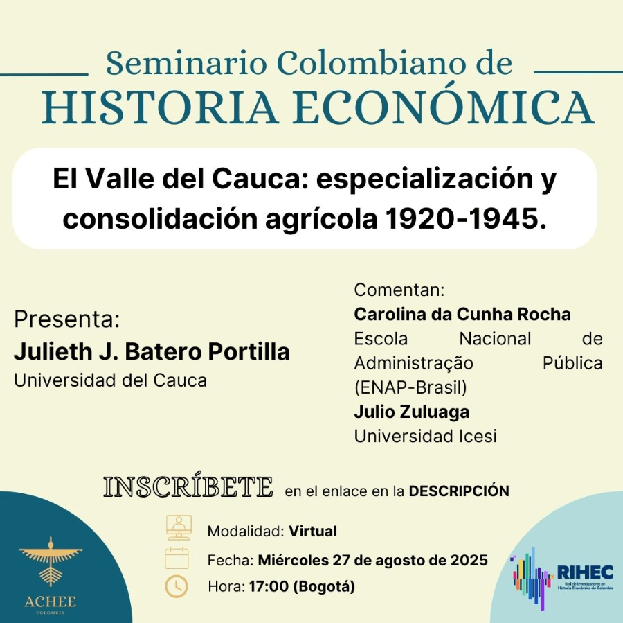 La Asociación Colombiana de Historia Económica y Empresarial (ACHEE) invita a la sexta sesión del Seminario Colombiano de Historia Económica. En esta ocasión nos acompaña Julieth J. Batero Portilla en calidad de presentadora (Universidad del Cauca), Carolina da Cunha Rocha (ENAP-Brasil) y Julio Zuluaga (Universidad Icesi) en calidad de comentaristas.